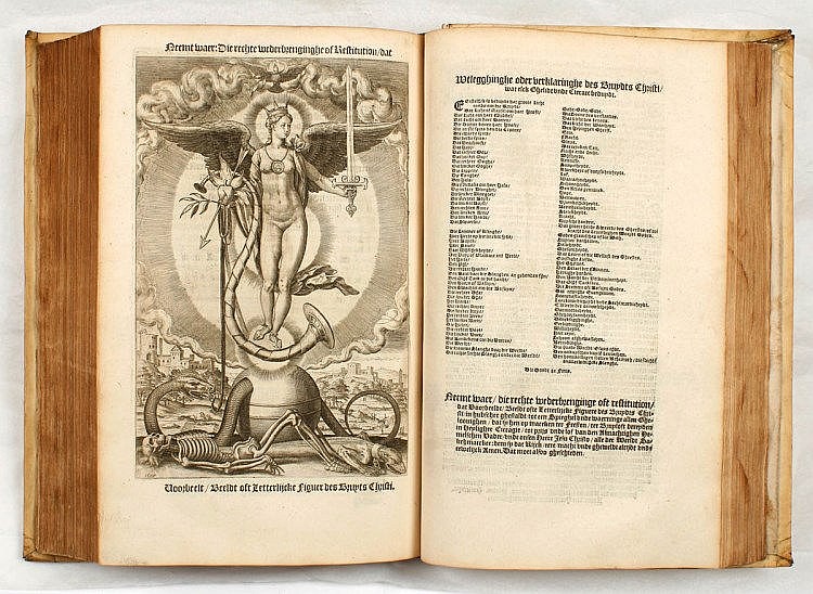 von wahr und unwahr, der duchstochene Apfel als Zeichen, dass dieses Kapitel zuende ist, was auch das Skelett unter ihren Füssen hervorhebt mit der bösen Schlange...die Krone als Zeichen ihrer Himmelsgöttlichkeit, die Kette um den Hals mit einem Symbol, oder ist da Jesus abgebildet? Und weshalb Fussbekleidung, sie schwebt ja über der Erdkugel? Das ist nicht konsequent, da sie ja sogar das Feigenblatt in der Hand hält, und ihre Scham entblösst ist - und recht dunkel wirkt, sowie auch ihre Flügel - dazu dann noch die Trompete des jüngsten Gerichts...